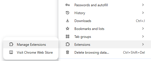 Open the Chrome browser. On the top right, you’ll see three dots to “Customize and control Google Chrome.” Click that. Then select Extensions and Manage Extensions in the list that appears: